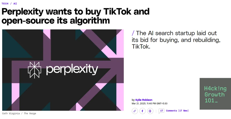 最后是激进的公关策略。Perplexity的CEO Aravind Srinivas非常擅长制造话题。当TikTok面临禁令时,他公开提议合并Perplexity与TikTok美国业务,这个消息登上了主流媒体头条。他还经常在Twitter上与马斯克互动,每次互动都能带来一波媒体报道。这些看似冒险的公关动作,实际上是在AI热度周期中持续收割免费曝光。