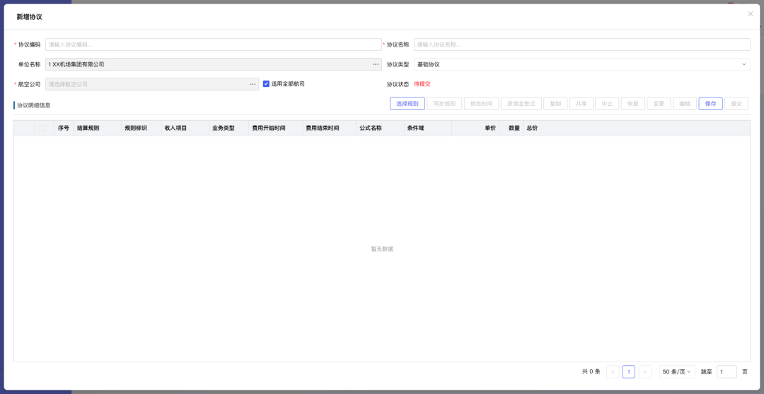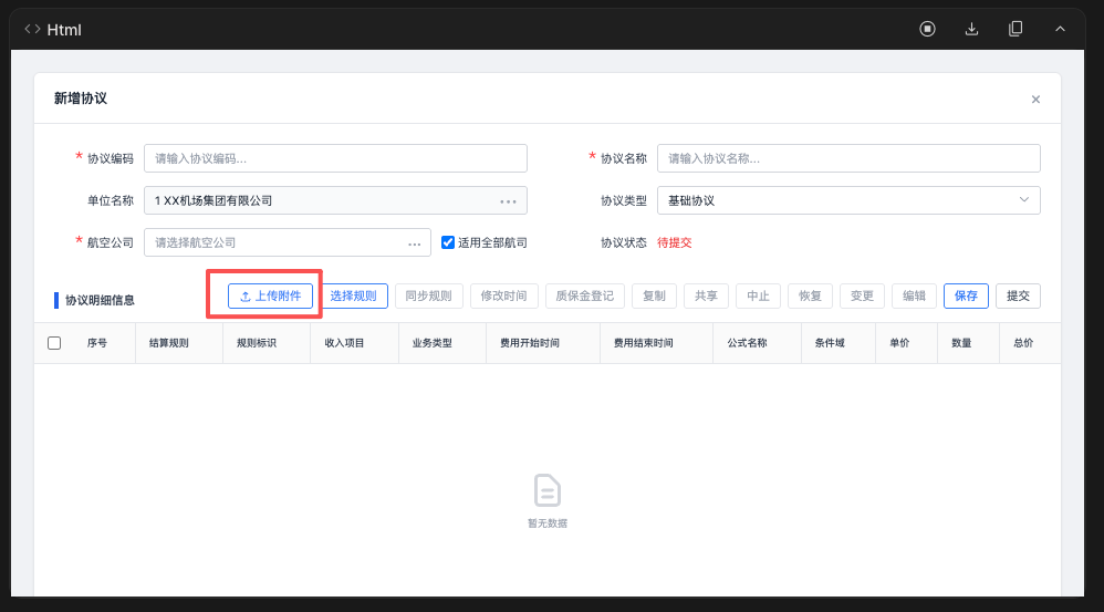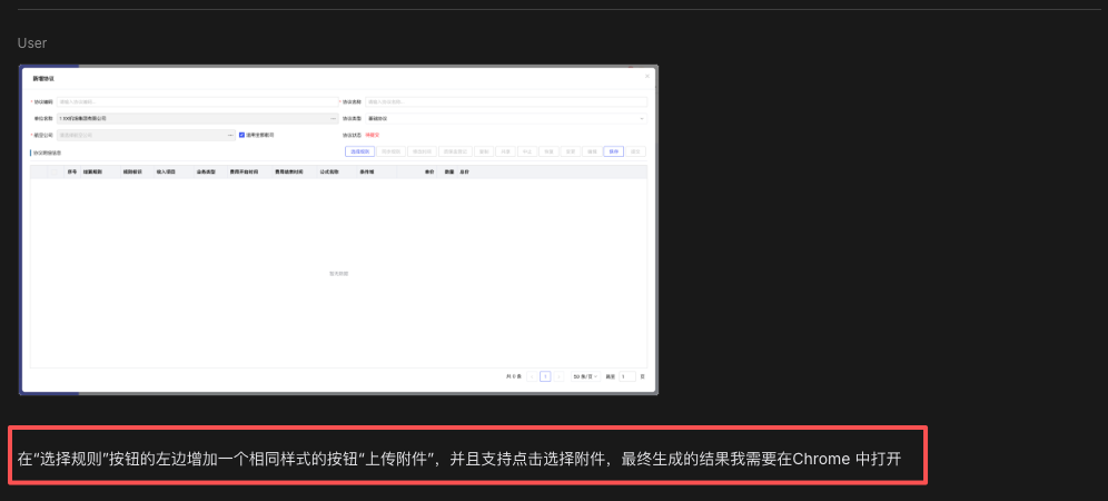 在新增协议的时候可以上传附件,这个需求是计划要做的。 因为目前阶段有更高优先级的需求在做,研发资源也比较紧张,而且不影响功能正常使用,所以暂时还没有排期。 现在系统中实际页面是这样的,注意「选择规则」按钮左边什么都没有: