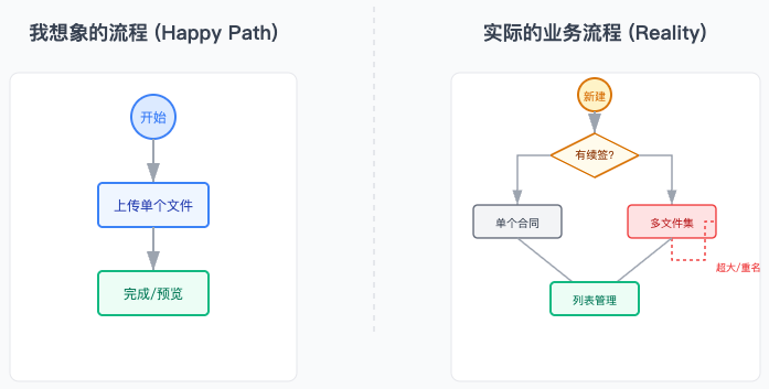 - 离业务一线太远:如果我不了解合同管理的真实场景(续签、补充),我就永远想不到多文件的需求。产品经理的想象力,永远填补不了业务的真实度。