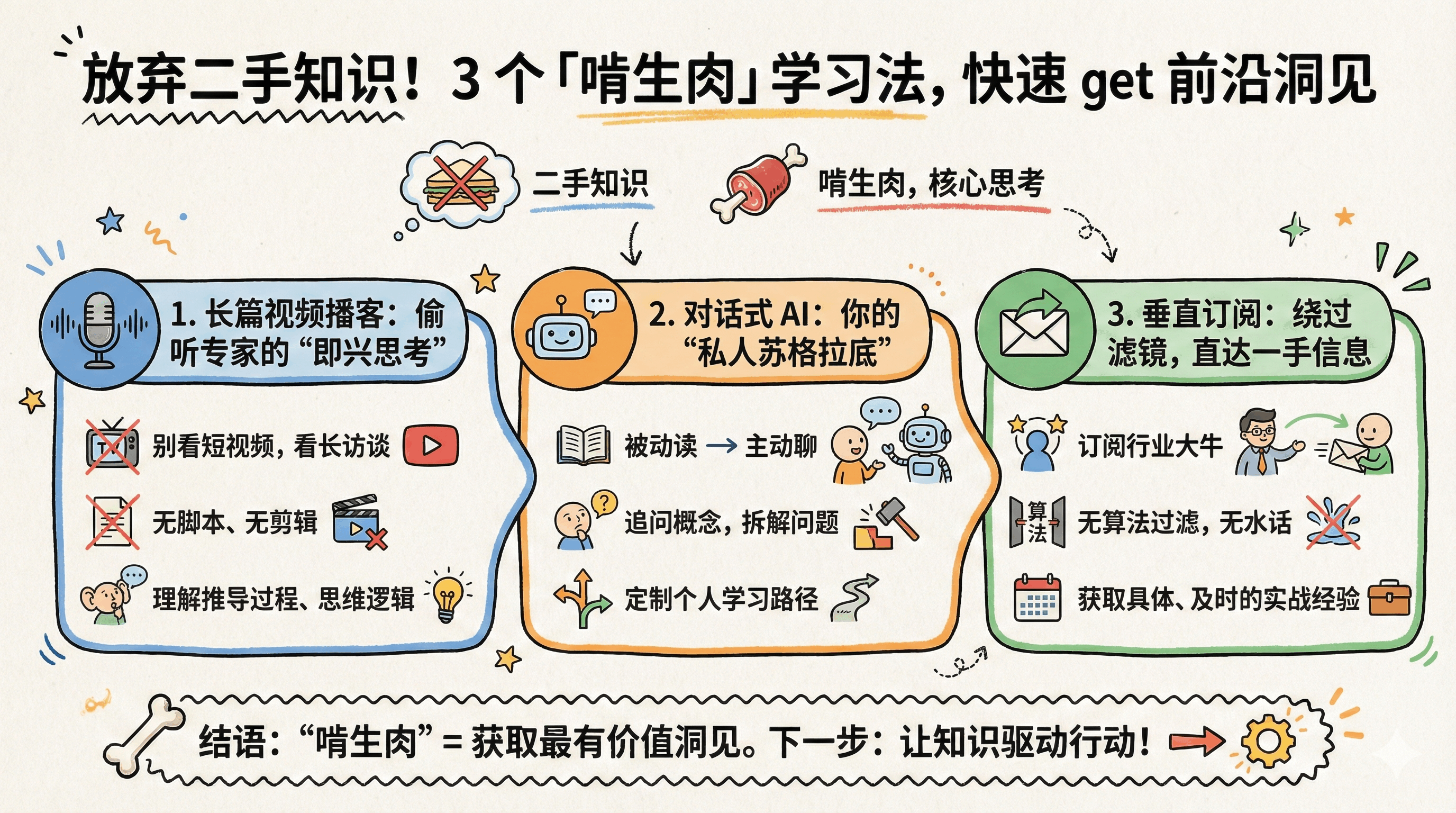 核心逻辑就是 “啃生肉”:大多数人回避的、晦涩的、一手的内容,恰恰藏着最有价值的洞见。但获取知识只是第一步,更重要的是把它变成 “能驱动行动” 的东西。
