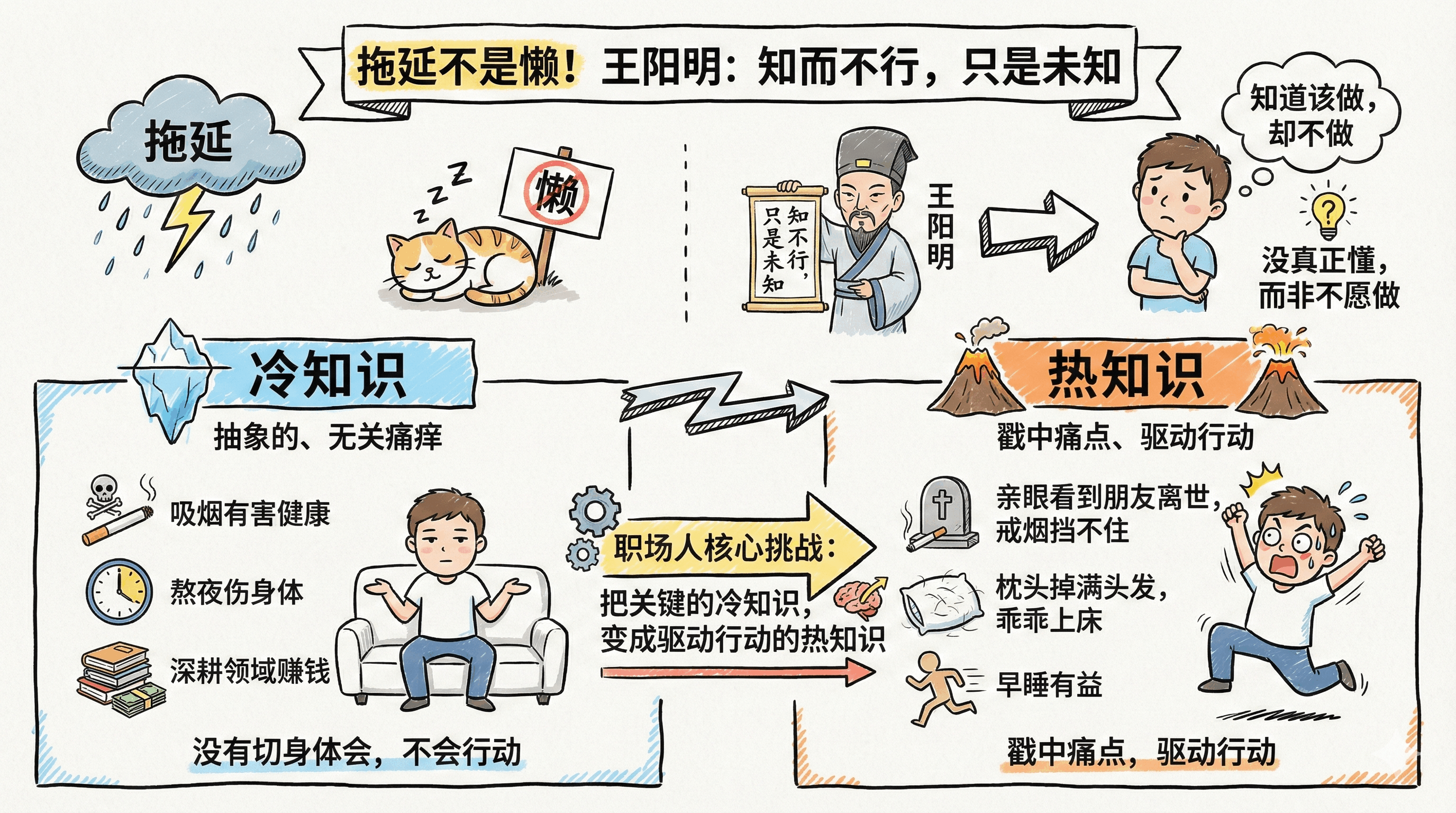 很多人把拖延归因为 “意志力薄弱”“懒”,但真相远比这深刻 —— 正如王阳明所言,“知不行,只是未知”:你之所以 “知道该做,却不做”,根本不是 “不愿做”,而是 “没真正懂”。