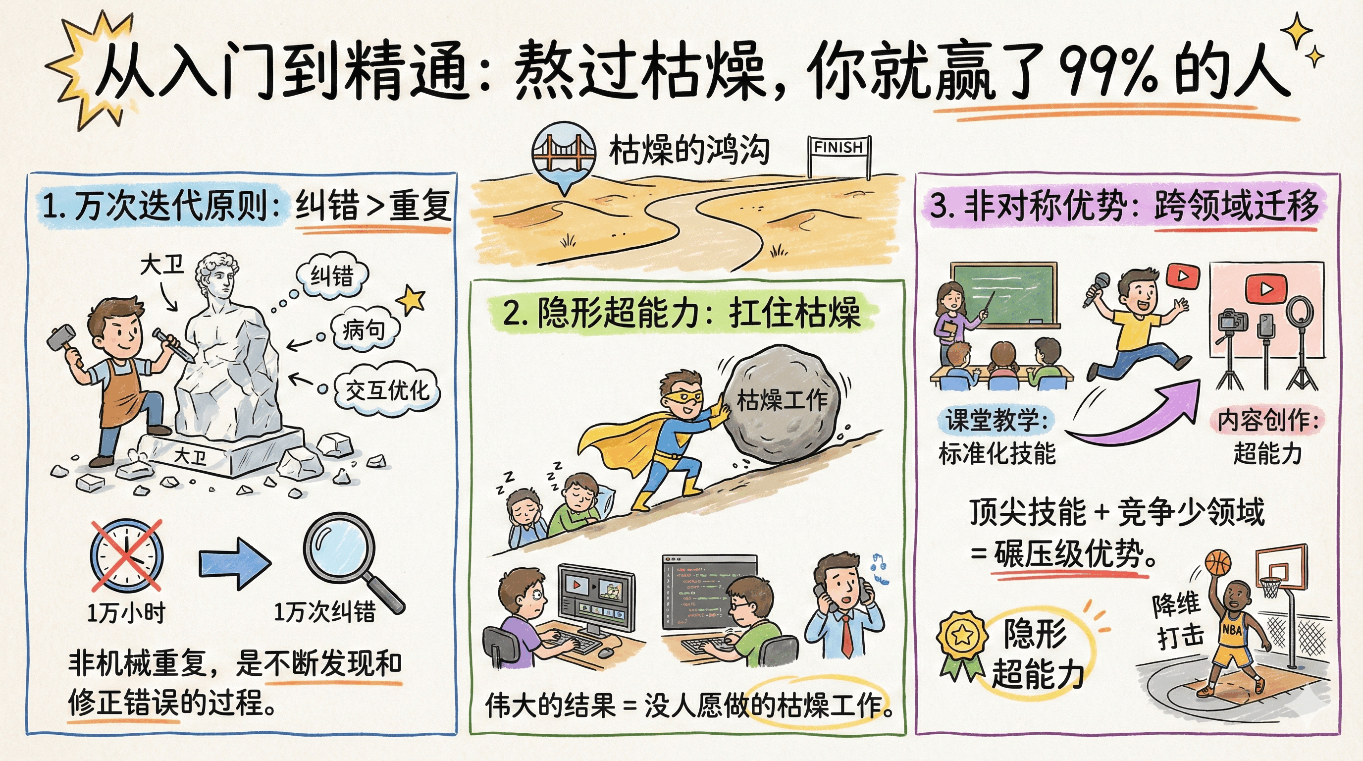 把冷知识变成热知识,解决了 “愿不愿行动” 的问题;但要达到 “精通”,还需要跨越 “枯燥的鸿沟”—— 真正的本事,都是在重复、纠错、坚持中磨出来的。
