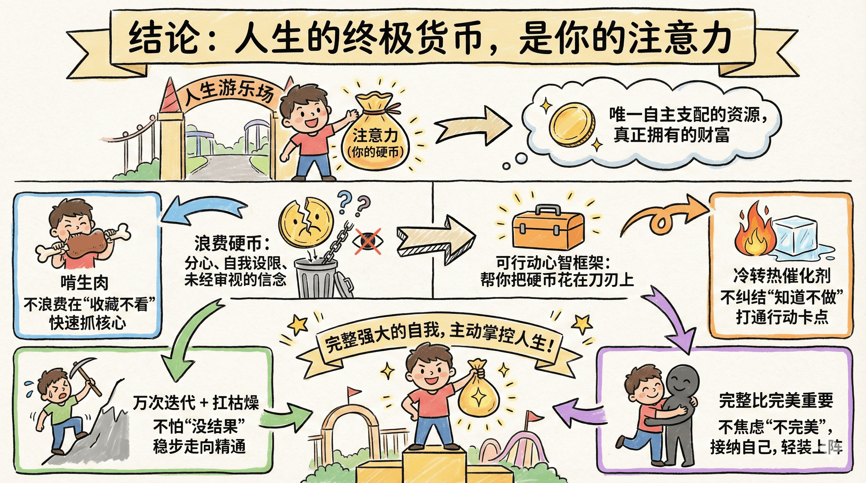 每一次分心、每一个自我设限、每一个未经审视的信念,都是在浪费硬币。而这个 “可行动心智” 框架,本质上就是帮你 “把硬币花在刀刃上” 的工具 ——