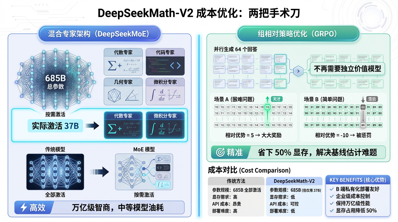 作为商业产品,抛开成本谈性能都是耍流氓。DeepSeekMath-V2 是基于 685B(6850 亿)参数的底座训练的,听到这个数字,很多人的第一反应是:这推理成本得是个天价吧?