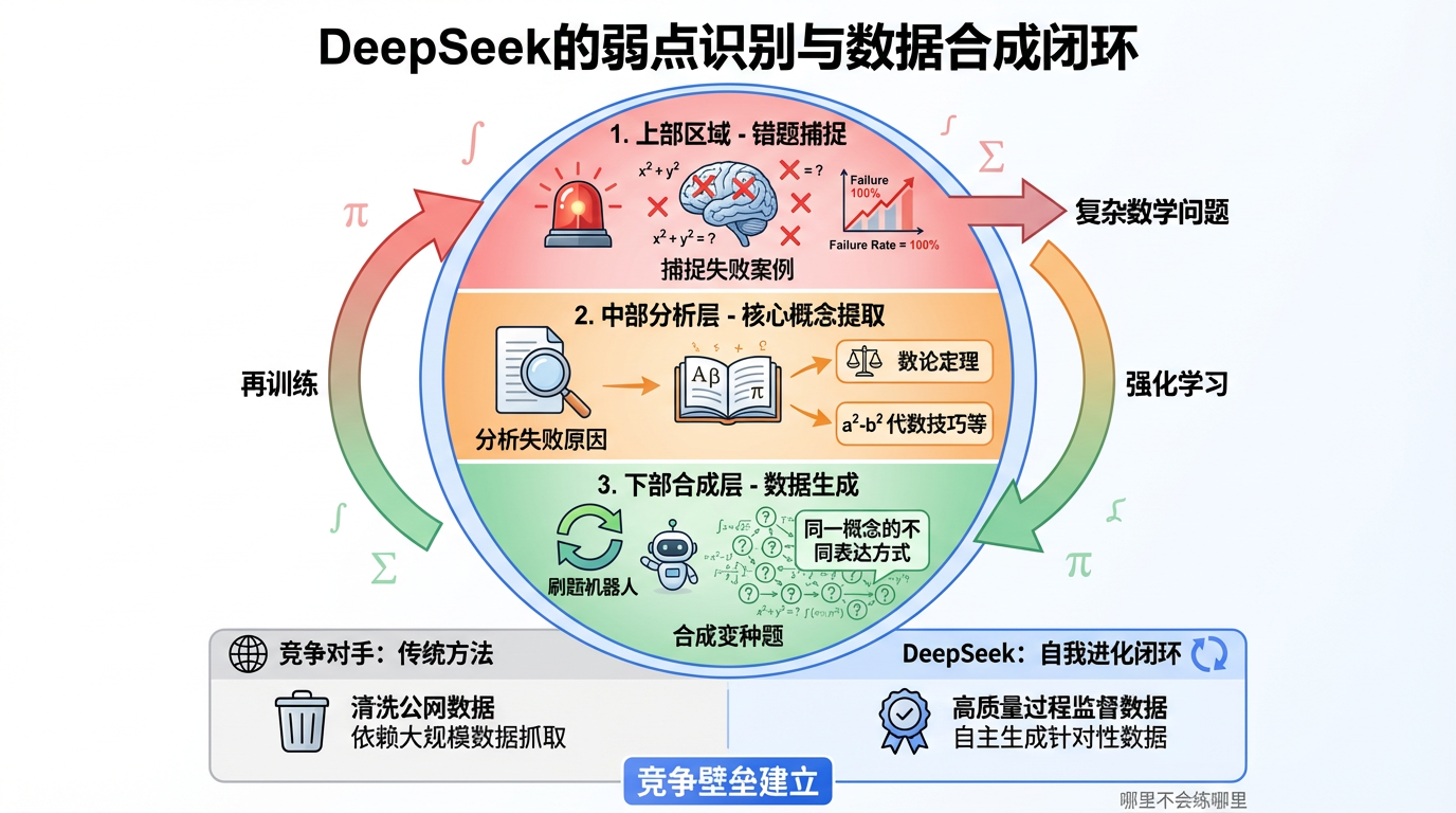 然后,它不是简单地丢弃,而是分析这些失败案例,提取其中的核心数学概念(比如某个特定的数论定理),然后利用合成数据技术,针对性地造出成千上万道类似的变种题,再喂给模型吃。