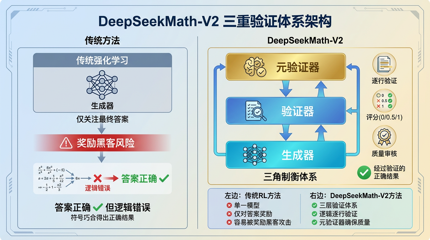 DeepSeekMath-V2 不再是一个单一的“生成模型”,它构建了一个类似公司内部的“制衡体系”: