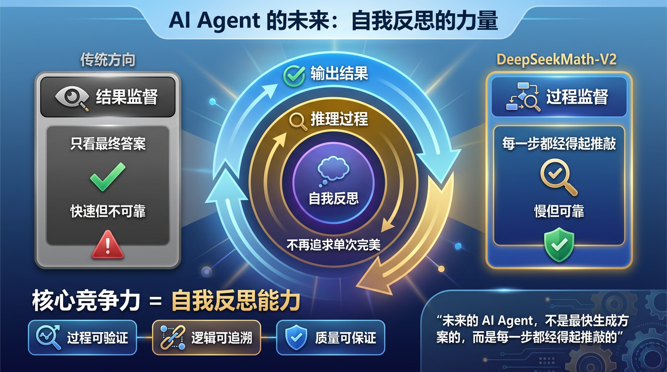 DeepSeekMath-V2 证明了,通过自然语言进行的“过程监督”,比单纯的“结果监督”更有效。它不再追求单次生成的完美,而是追求在推理链条上的每一步都经得起推敲。