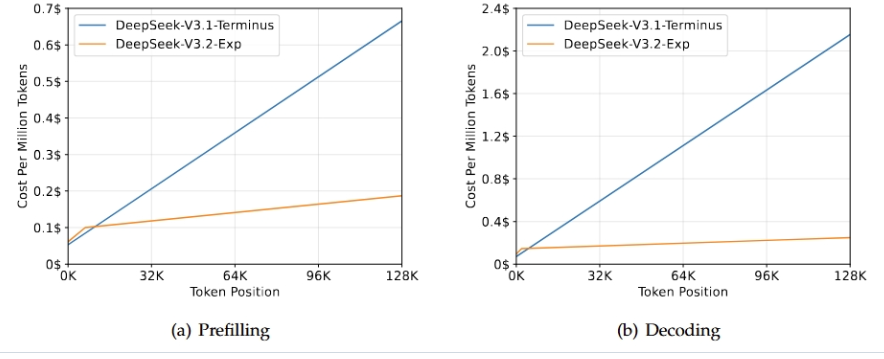 - 再开稀疏阶段(15 k 步,943 B token)每查询仅取 2048 键值对。128 k 序列实测:H800 集群预填充成本从 0.7 → 0.2 美元/百万 token,解码从 2.4 → 0.8 美元,提速数倍。