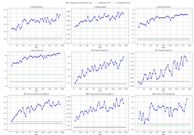 - 搜索Agent方面:通过多Agent流水线生成训练数据:先采样大规模语料中的长尾实体,再经问题构建、答案生成与验证,产出高质量数据。DeepSeek-V3.2在SWE-Verified达73.1%解决率,Terminal Bench 2.0达46.4%准确率,显著超越开源模型,并在MCP-Universe、Tool-Decathlon等工具基准上逼近闭源模型表现