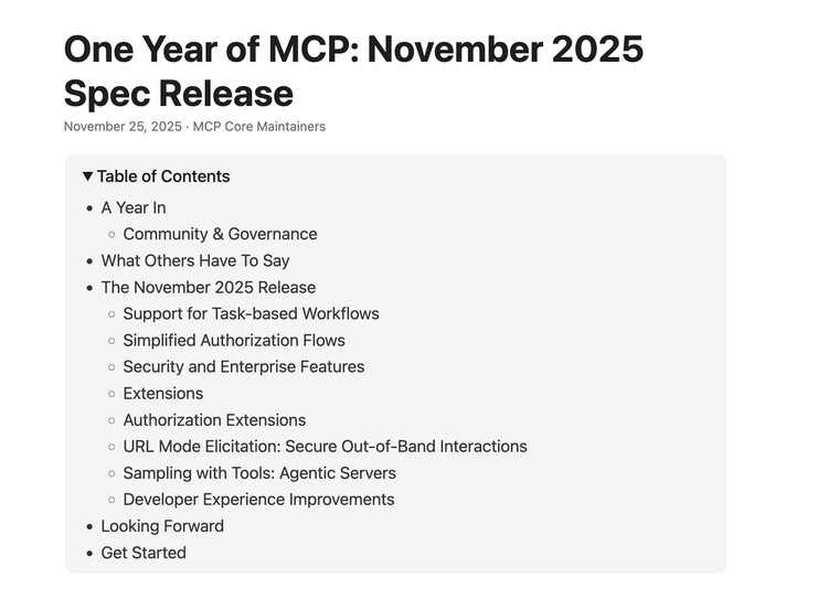 11 月 25 日,Anthropic 官方博客更新了一篇庆祝帖,宣布 MCP 正式满一周岁,配合发布的还有一份新版规范。