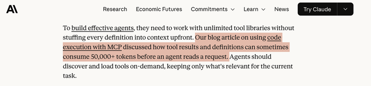 Anthropic 自己也承认了这个问题。他们在博客里写道,当 Agent 需要读取一份两小时会议的文档时,可能要额外处理 50000 个 Token,更大的文档甚至会直接超出上下文窗口限制,整个工作流直接崩溃。