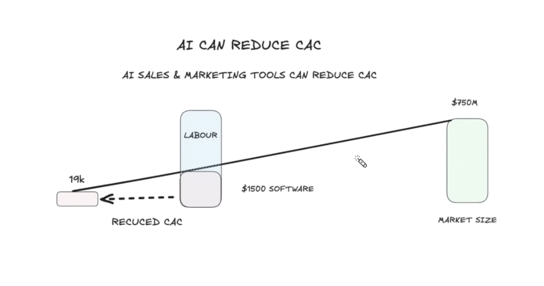 首先说客户终身价值。因为 AI 可以把劳动转化为软件,正确的软件可以大幅减少企业在销售、营销、客户服务、运营等方面的内部和外部劳动力支出。这让企业愿意在产品或软件上花费更多的钱,相比传统 SaaS,可以将终身价值和潜在市场规模提高 2 到 15 倍。我觉得这是最关键的变化。想象一下,如果一个软件每个月能帮你节省 5000 美元的人工成本,你愿意为这个软件支付多少钱?肯定不止 100 美元。可能 1000 美元、2000 美元都是合理的。这就是为什么 Barti 能收取每月 1500 美元,而传统 CRM 只能收 100 美元。