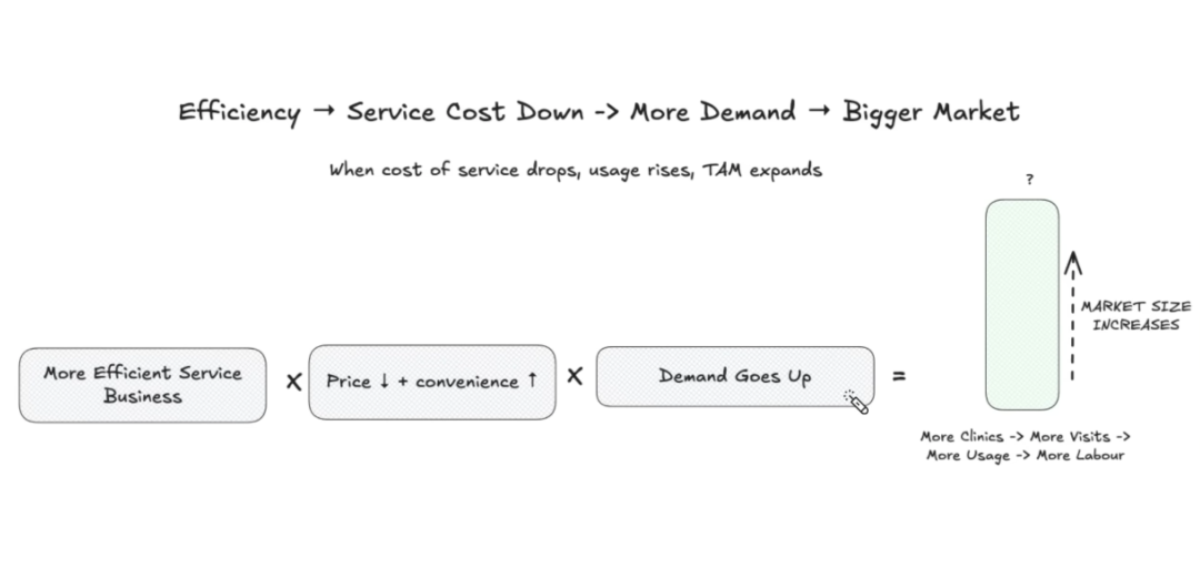 Ben 还提到了第三个因素,这个我之前没有想到,但想通了之后觉得非常有道理。通过你的 AI 软件提高企业运营效率,可以降低企业本身的服务成本。这通常会导致对该服务的需求增加,从而进一步扩大潜在市场规模。比如说,医生花在行政工作上的时间少了,就能接待更多客户。预约流程更高效了,价格可以降低。用户的便利性提高了。历史数据显示,当这些事情发生时,对服务的需求会上升。以前人们可能一年去一次眼科医生,现在可能去两次。以前负担不起眼科医生的人现在可以去了,因为服务变便宜了。