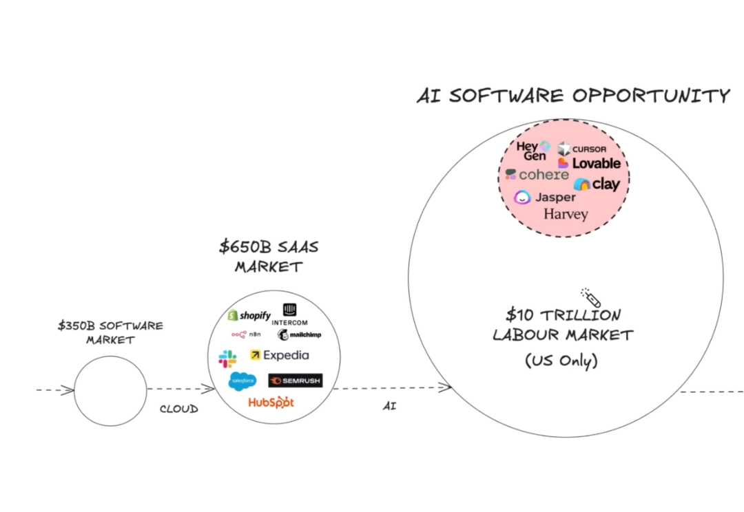 我自己思考了很久这个数字背后的含义。在软件时代,创业者主要在做的是把信息数字化、让流程更高效。但 AI 做的是完全不同的事情:它在直接替代人的劳动。一个传统 CRM 软件可能帮你管理客户信息,但它不会帮你打电话、不会帮你写邮件、不会帮你分析客户需求。而 AI 可以做所有这些事情。这就是为什么同样一个市场,在 SaaS 时代可能只值 2000 万美元,但在 AI 时代可能价值 5 亿甚至 10 亿美元。