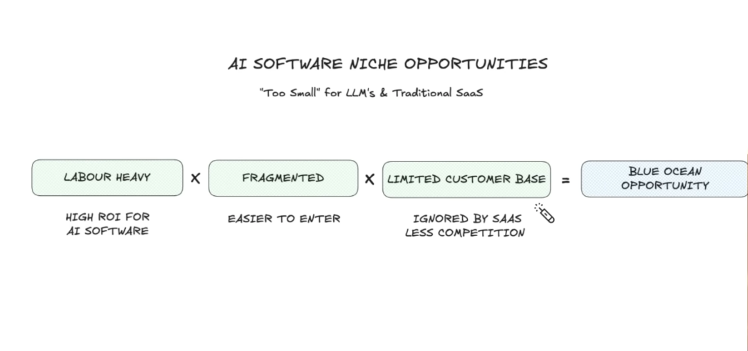 我自己对这个公式做了进一步思考。传统商业思维告诉我们要去追求大市场、要规模化、要快速增长。但在 AI 时代,这个逻辑被颠覆了。那些看起来”太小”的市场,恰恰是大公司不会去做、竞争最少的地方。而且因为 AI 能够大幅提高客单价和降低获客成本,这些小市场突然变成了非常有吸引力的机会。
