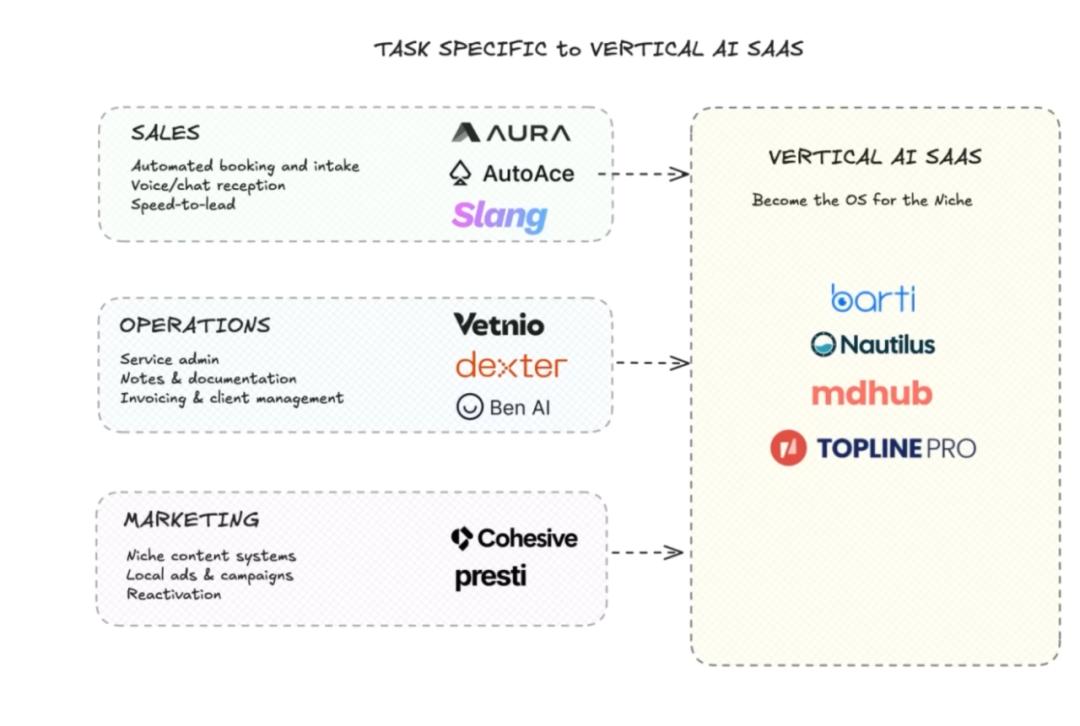 Ben 总结了目前在这些小众市场中出现的两类 AI 软件。第一类是针对特定功能的 AI 软件,专注于一个特定的劳动部门,比如销售、服务交付或营销。第二类是垂直 AI SaaS,为整个细分行业提供全套解决方案。
