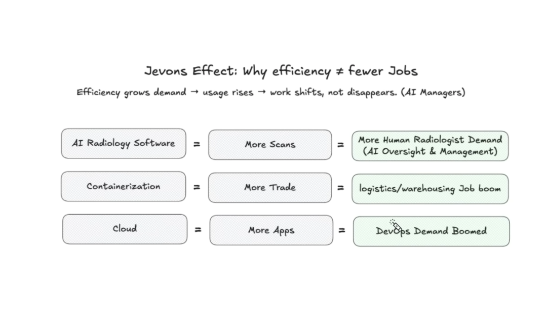 这让我想起了经济学中的 Jevons 效应(Jevons Paradox)。Ben 也提到了这个概念,当一个行业或企业提高效率时,往往会导致更多的使用,这通常会带来更多的劳动力需求,而不是减少。虽然 AI 可能会取代一些低级别的工作,工作性质会有所转变,但新的工作也很可能被创造出来,因为人们需要管理这些 AI 软件,也需要人工监督。AI 放射学软件已经比人类放射科医生更擅长诊断了,但这也意味着放射学的成本下降,导致扫描需求增加,因此实际上人类放射科医生的需求反而增加了。集装箱化最初取代了码头的一些劳动力,但导致全球贸易大幅增加,物流和仓储工作出现了巨大增长。云计算转型取代了一些服务器管理工作,但导致互联网上出现大量新应用,从而使 DevOps 和其他类型的工作大幅增长。