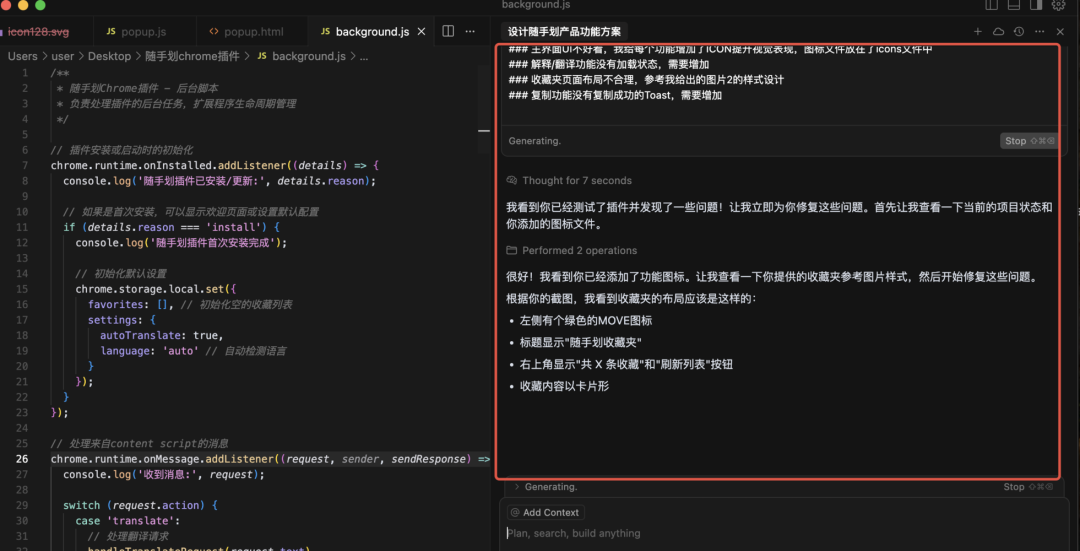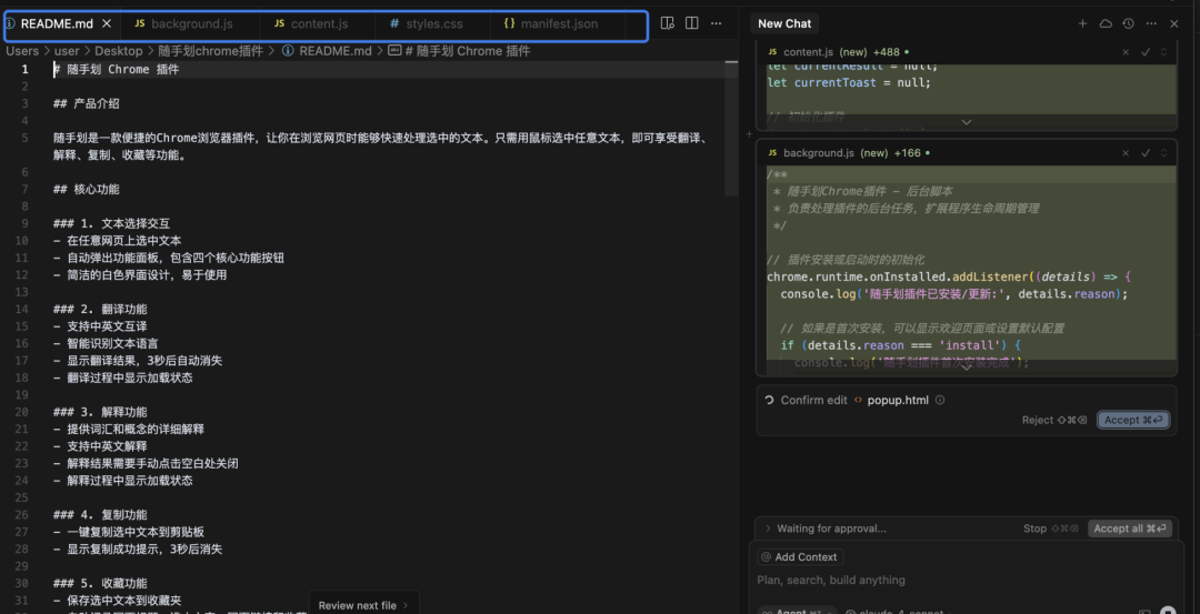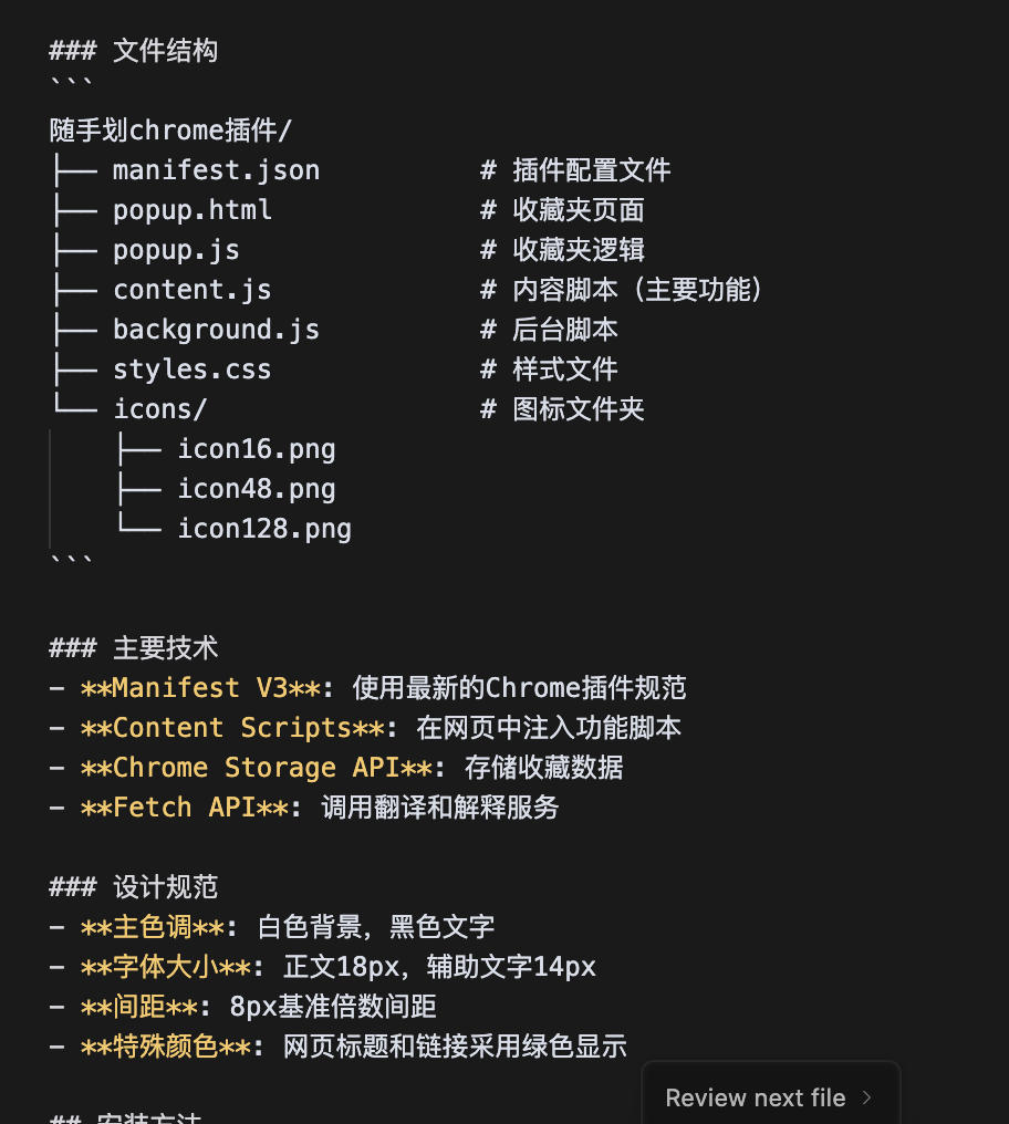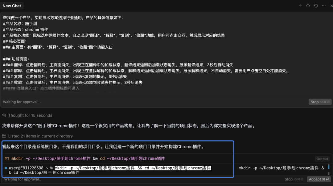 此外,非常建议在Prompt中强调“不需要用代码的形式呈现,只需要像产品需求说明那样,文字总结即可”,Cursor真的太爱写代码了 ,没有这句话,在你没反应过来时,它已经又用代码呈现刚实现过的功能了。