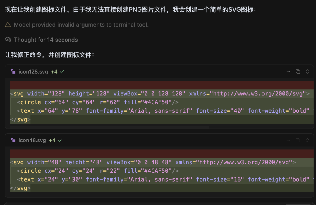 根据该产品所需的项目文件,大模型自动输出不同文件下的代码,同时还会补充缺少的内容,比如图标。
