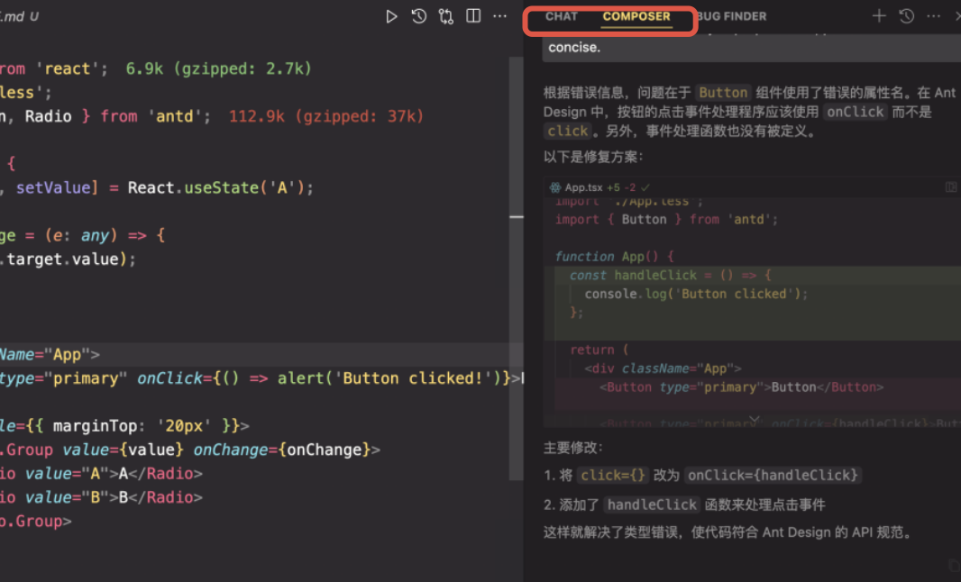 相比 Chat,Composer 能同时分析多个文件,理解代码上下文,并提供更合理的修改建议,从而提高方案的准确性,大幅提升开发效率。