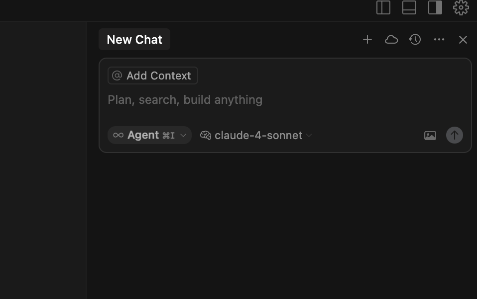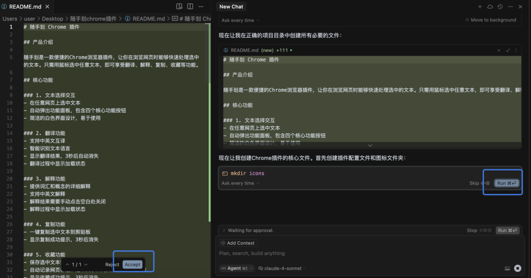 - 在Cursor AI对话框,选择Agent模式,模型选择:claude-4-sonnet