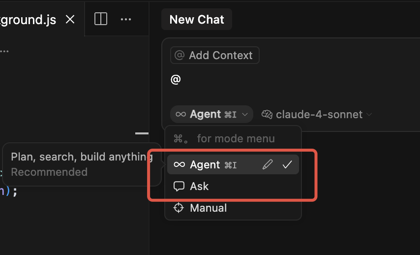 Cursor新版本chat和composer合并,默认是agent 模式,ask就类似我们的chat模式,cursor这样合并也更加符合产品发展理念,真正实现了从手动挡向自动挡转变。