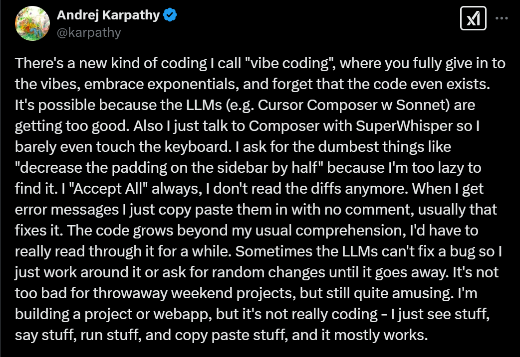 vibe coding,中文翻译过来就是「氛围编程」,每个人都可以用AI来实现自己的创意——即使你不是程序员,甚至没有写过一行代码。该术语由 AI 大神Andrej Karpathy于 2025 年初提出,用于描述一种流程,在该流程中,开发者以普通语言来指示 AI 工具生成。