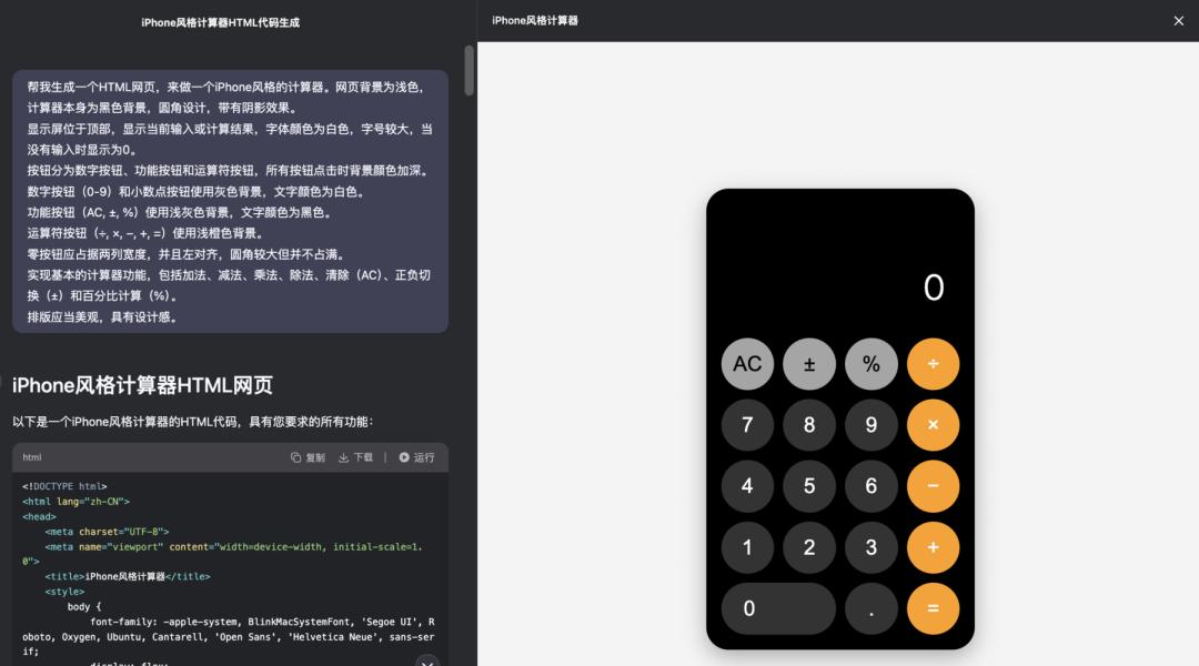 帮我生成一个HTML网页,来做一个iPhone风格的计算器。