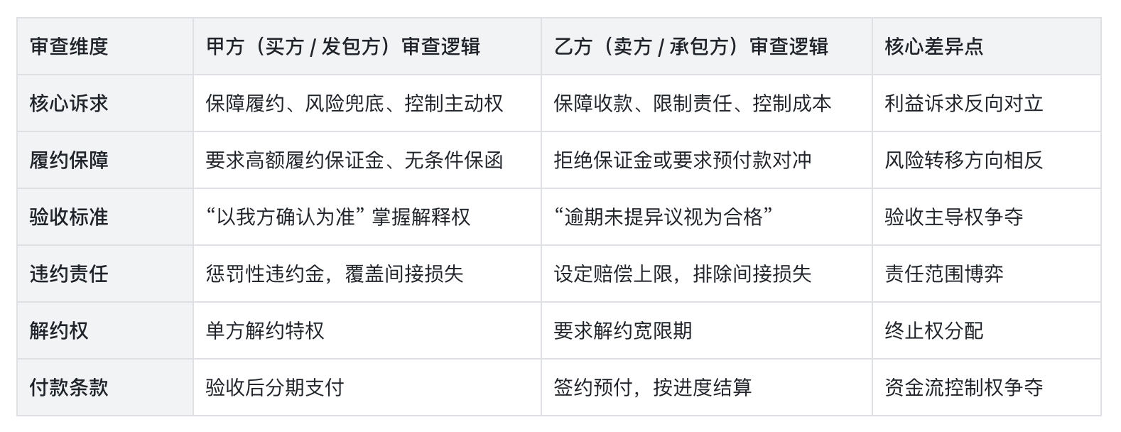合同本质是商业利益博弈的法律载体,同一条款对甲乙双方价值相反。例如 “单方解除权” 对发包方是风控利器,对承包方则可能导致项目夭折;“以审计结果为准” 可能成为甲方拖延付款的借口。