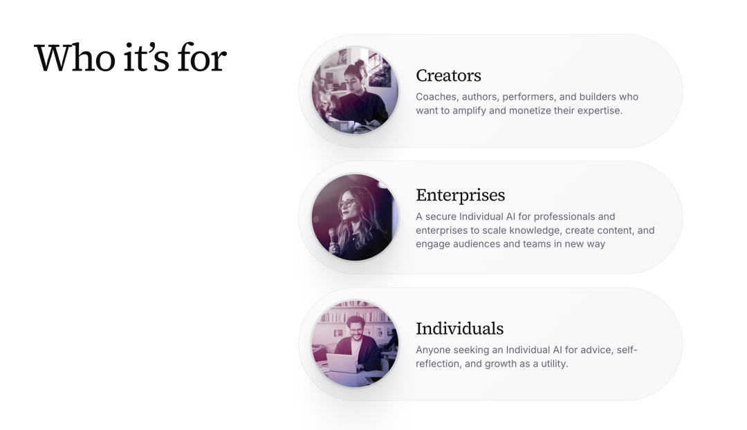 对于网红和公众人物来说,个人 AI 可以帮助他们在规模化的同时保持真实互动。你的 AI 可以和粉丝互动、回答常见问题、提供个性化回应,而且感觉起来真的是”你”在回复。这让你可以把时间和精力集中在创作内容和服务核心观众上,而不是淹没在日常互动中。