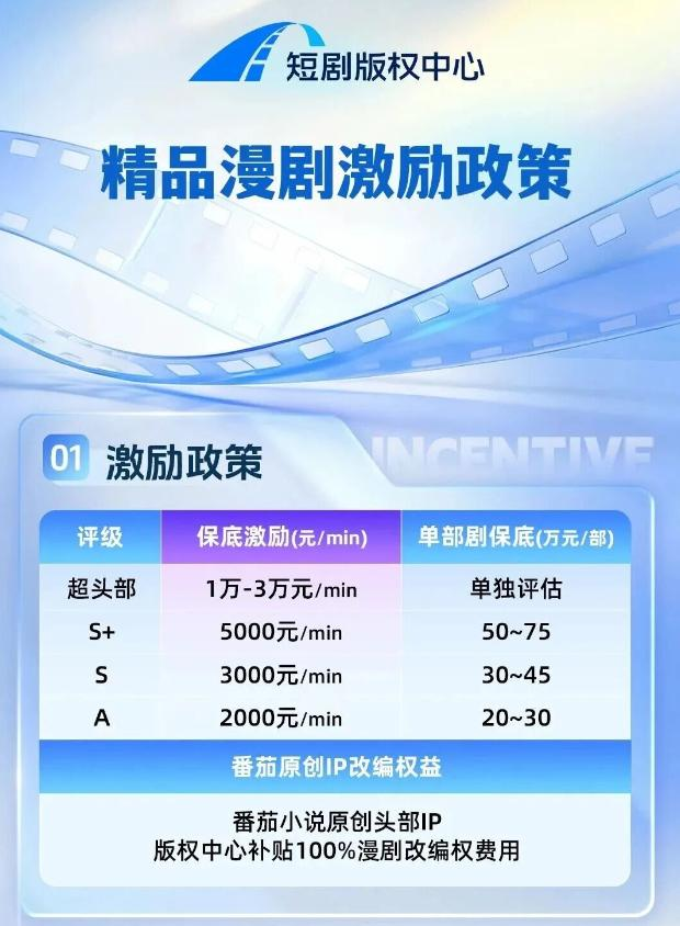 抖音集团短剧版权中心于11月初发布精品漫剧激励政策,对S+级作品提供每分钟5000元、单部50万至75万元的保底;超头部作品保底甚至高达每分钟1万至3万元,金额单独评估。