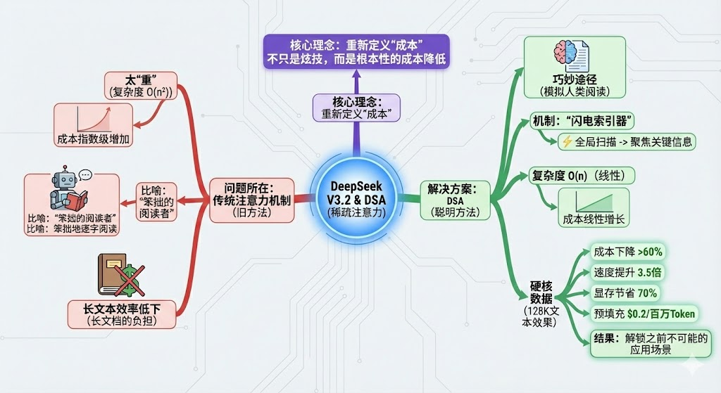 聊DeepSeek V3.2,绕不开它的核心技术:DSA,全称DeepSeek Sparse Attention。我知道,一听技术名词很多人就头大,但你别把它想得太复杂。在我看来,这玩意儿的精髓不是炫技,而是从根子上重新定义了“成本”这个概念