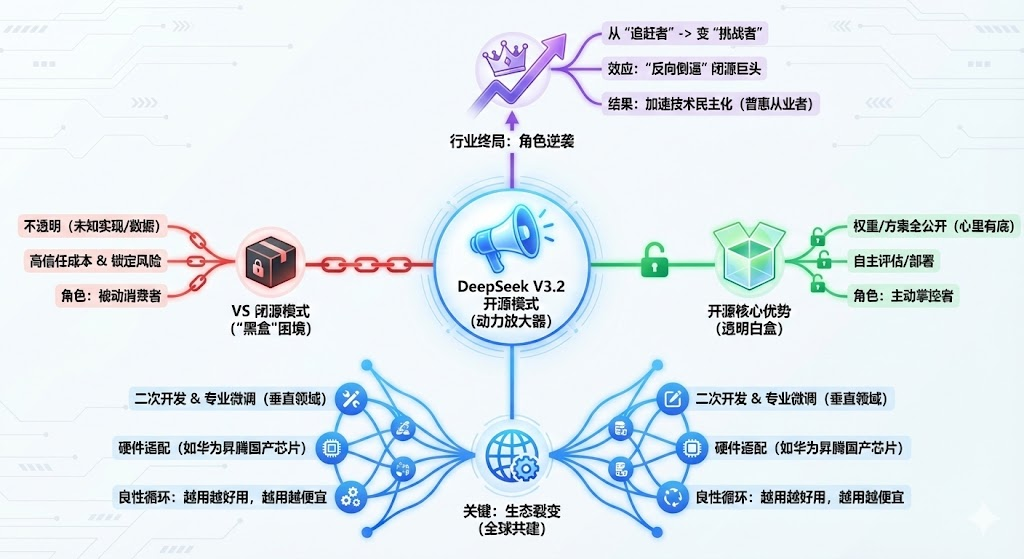 如果说DSA技术是成本革命的引擎,那开源模式就是把这个引擎动力无限放大的“放大器”。没有开源,DeepSeek V3.2的冲击力至少要减掉一半