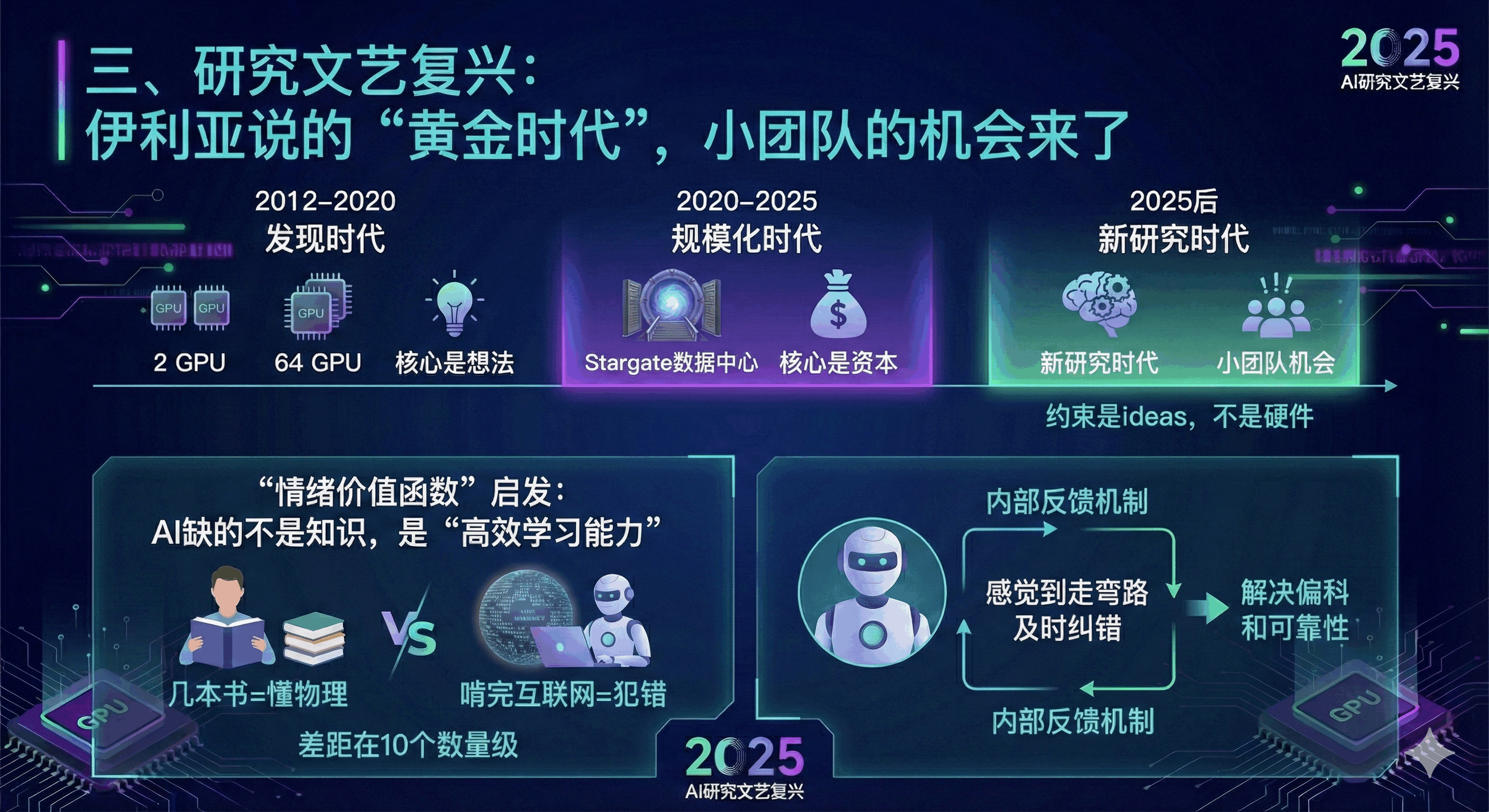 - 2025 后(新研究时代):约束条件是 ideas,不是硬件。