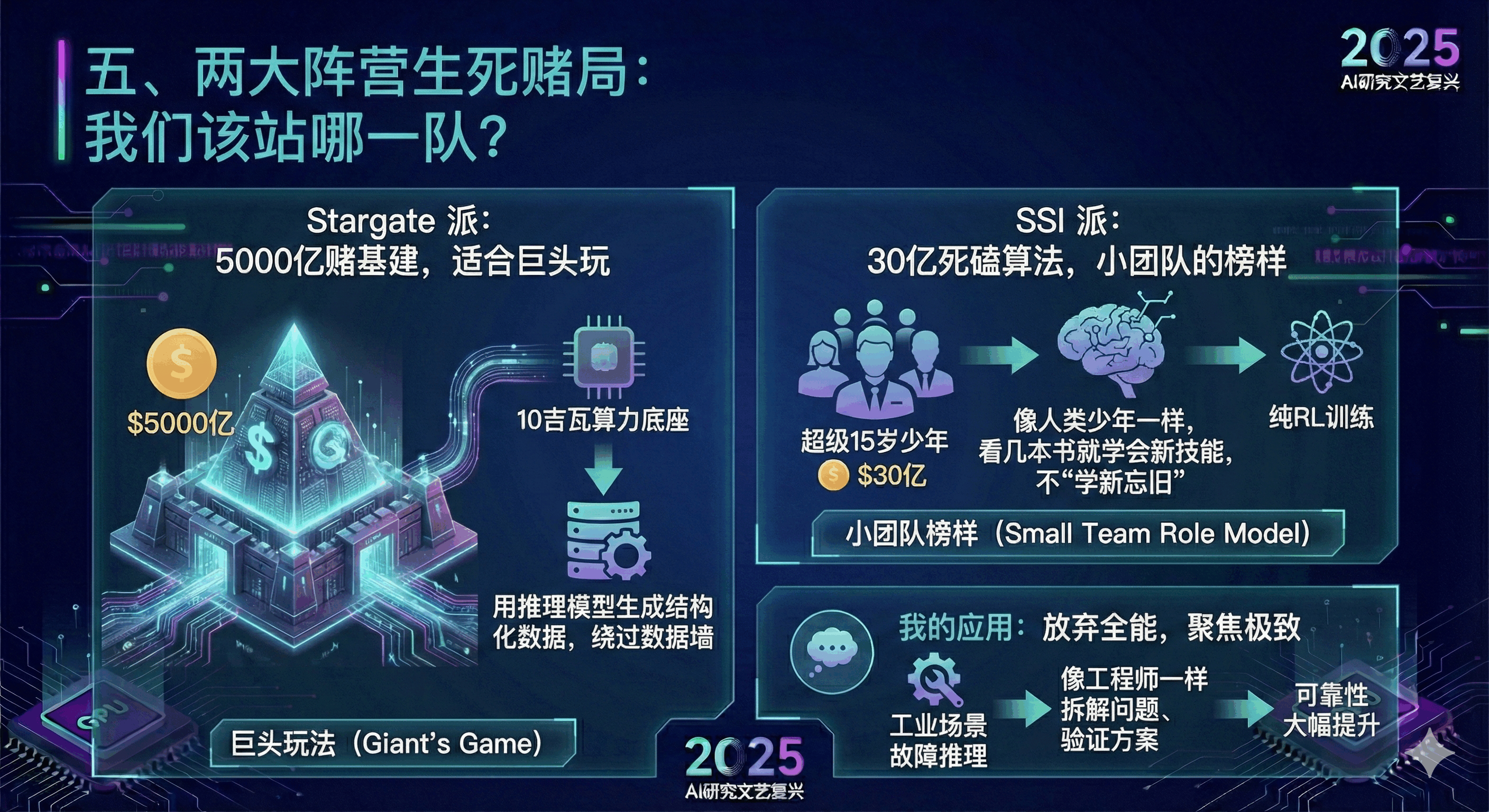 过去我们总被 “没算力没数据” 困住,但现在发现:巨头忙着建 5000 亿的 Stargate 数据中心,根本没精力做算法创新;而我们只要抓住 “样本高效学习” 这个核心,就能弯道超车。