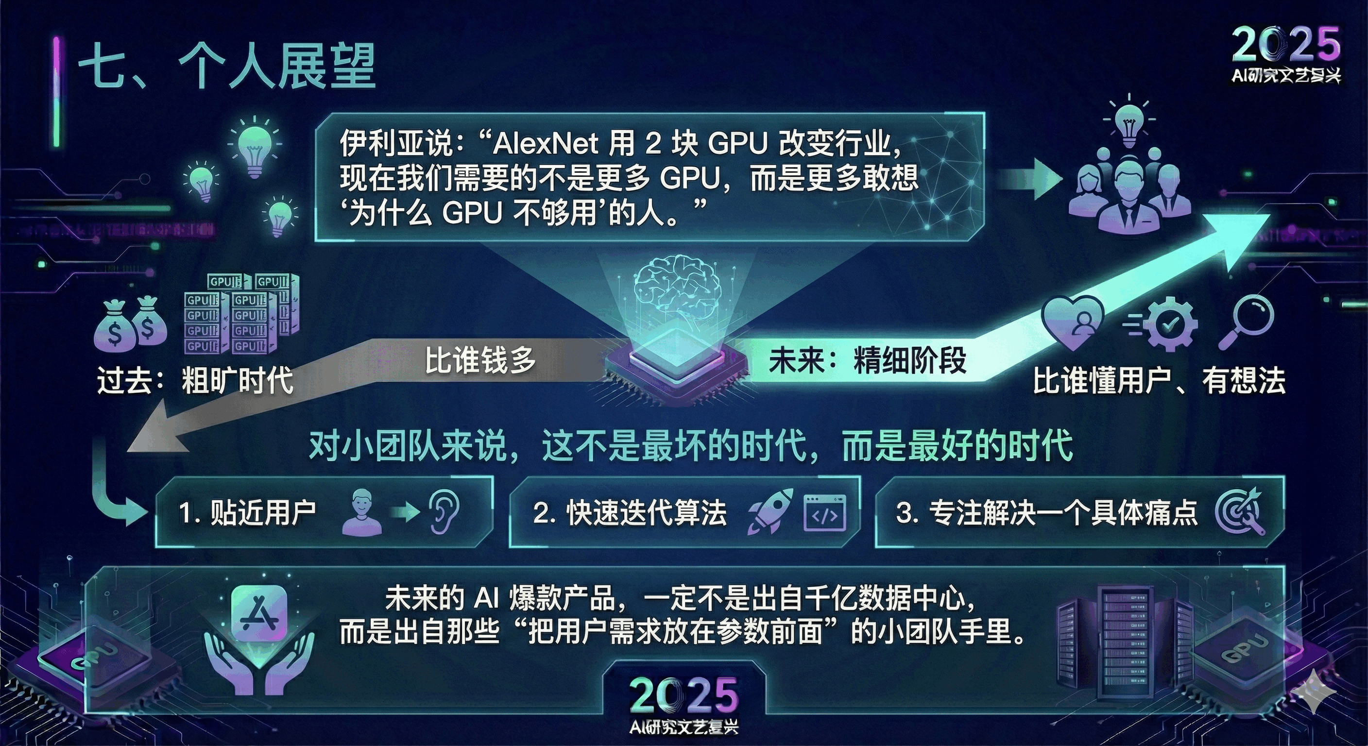 伊利亚说:“AlexNet 用 2 块 GPU 改变行业,现在我们需要的不是更多 GPU,而是更多敢想‘为什么 GPU 不够用’的人。” 这句话点醒了我:AI 行业终于告别了 “比谁钱多” 的粗旷时代,回到了 “比谁懂用户、有想法” 的精细阶段。