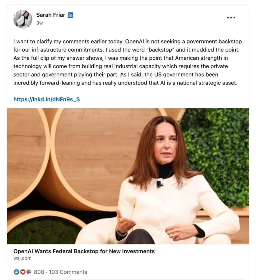 前段时间,OpenAI 的 CFO 萨拉·弗莱尔(Sarah Friar)表态支持引入政府为 AI 基础设施融资兜底的言论,也在美国引起不小争议,外界批评 OpenAI 试图让政府为其巨额 AI 投资买单。弗莱尔此后专门发文澄清,强调 OpenAI 并未寻求政府担保。