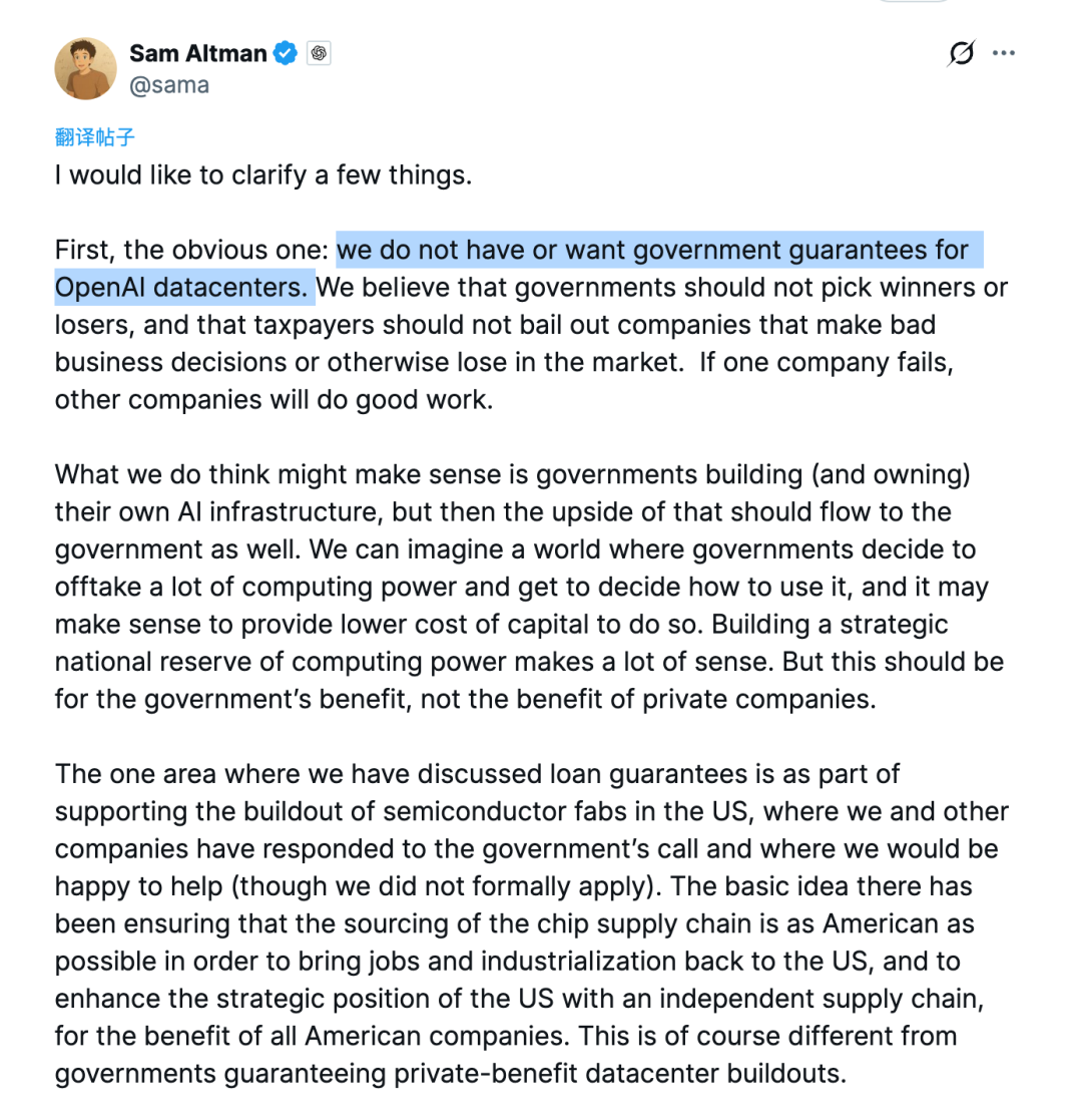 萨姆·奥尔特曼也不得不专门发布长文回应,“我们不需要也不希望政府为 OpenAI 的数据中心提供担保。”奥尔特曼称,OpenAI 将依赖自身收入增长、外部投资以及未来出售算力等方式来支撑其算力投资。
