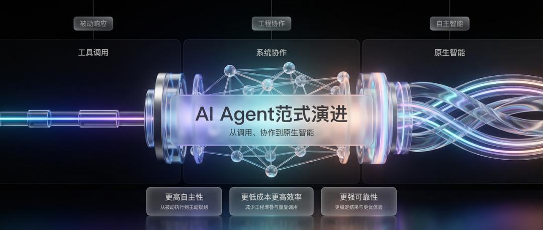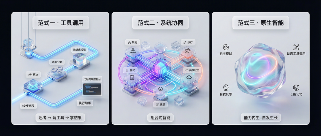 工具调用、系统协作、原生智能,像三层台阶,越往上越接近真正的自主智能。