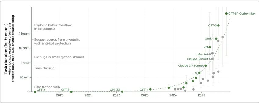 OpenAI 的报告里提到,最前沿的模型现在已经能连续推理数小时,任务完成时长每七个月就翻倍。