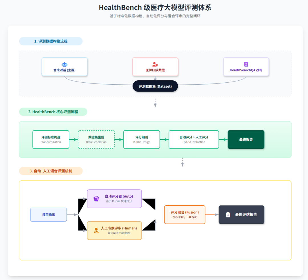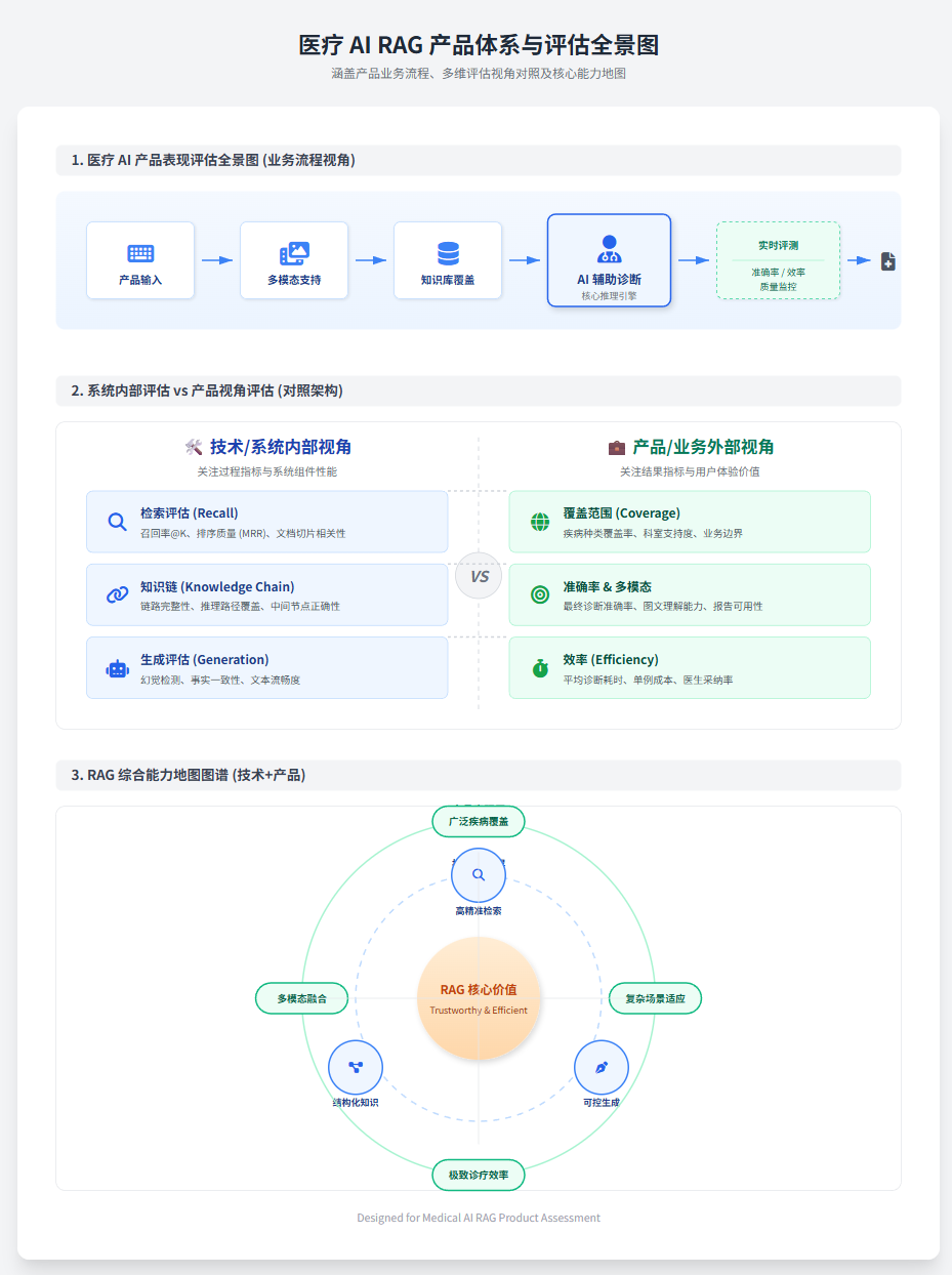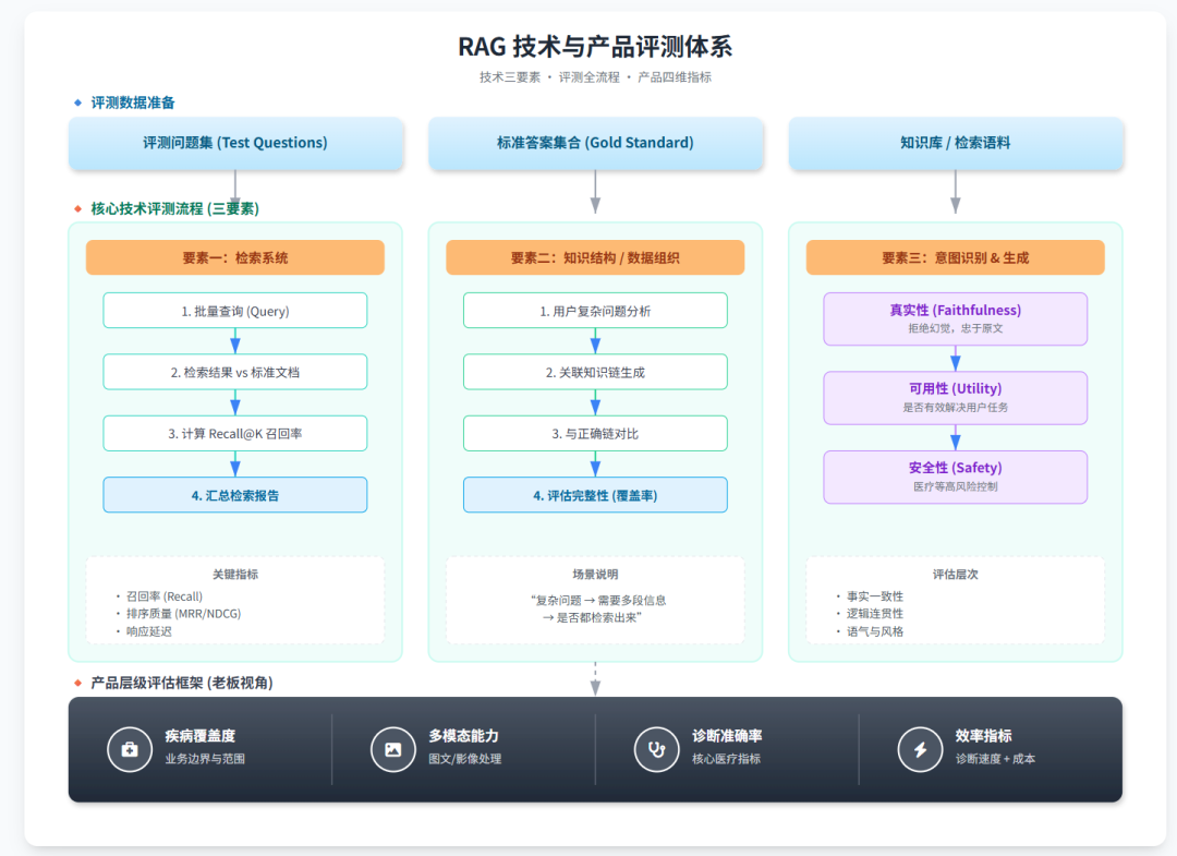 完整的视角的话,需要包含三个点:系统内部怎么评估:检索对不对、关系链拉得全不全、生成真不真、安不安全;产品视角怎么评估:业务边界、覆盖范围、多模态、准确率、效率这些老板真正关心的东西;评测体系怎么搭:像 HealthBench 那样,从标准 → 数据集 → 评分细则 → 人工+自动评估,一整套闭环;