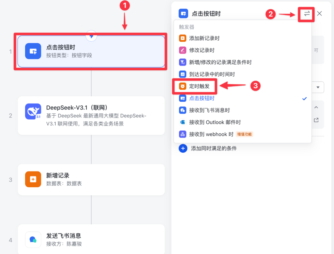 所以,接着我们回到多维表格工作流,把点击按钮时的触发条件换成定时触发。