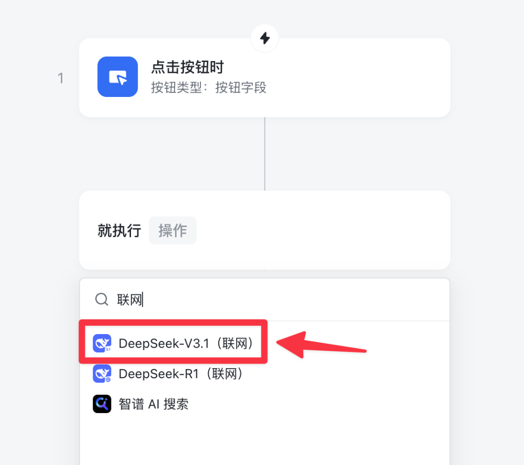 点击下面的「就执行」,然后在搜索框里搜索 “联网”,选择DeepSeek-V3.1(联网)。