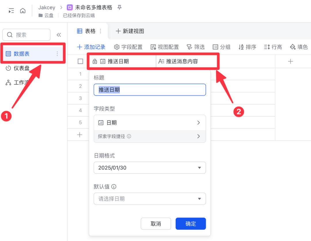 先把数据表的字段修改成「推送日期」和「推送消息内容」。