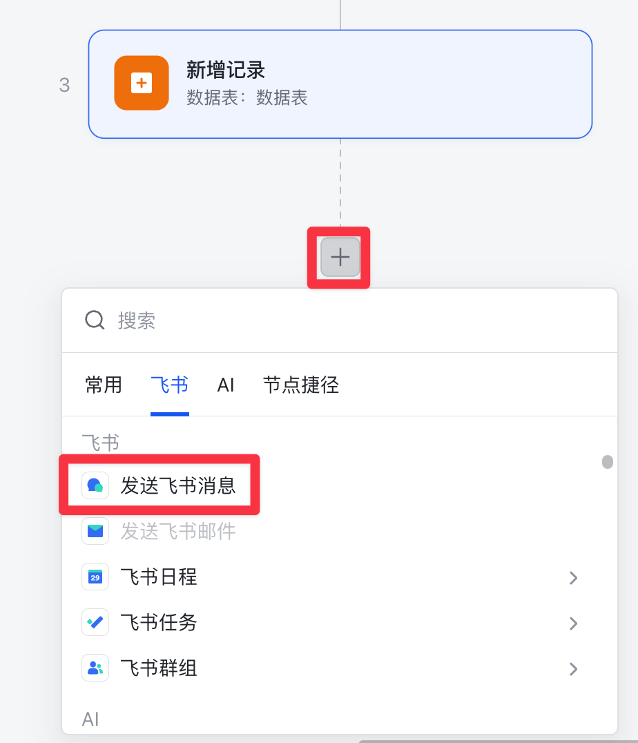 继续点加号新增节点,我们让它能发送消息到飞书给我们,所以选择,发送飞书消息