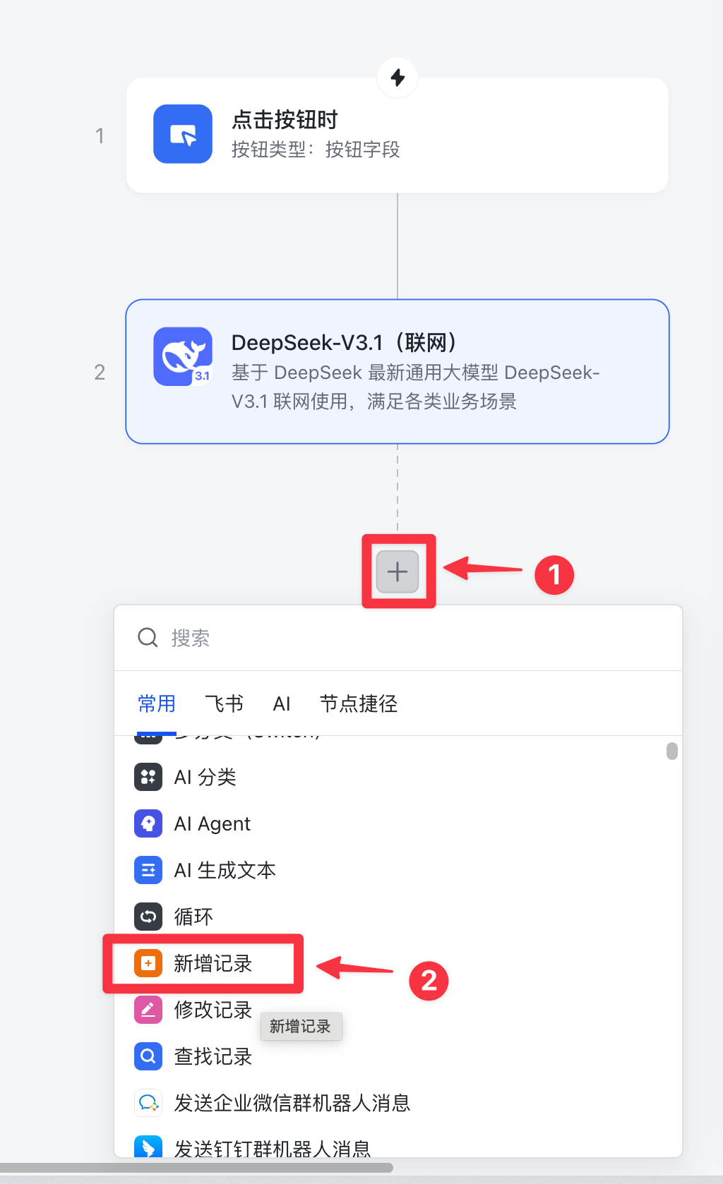 接着,继续添加节点,比如我想让生成的内容存到表格里,那我就加一个「新增记录」的动作