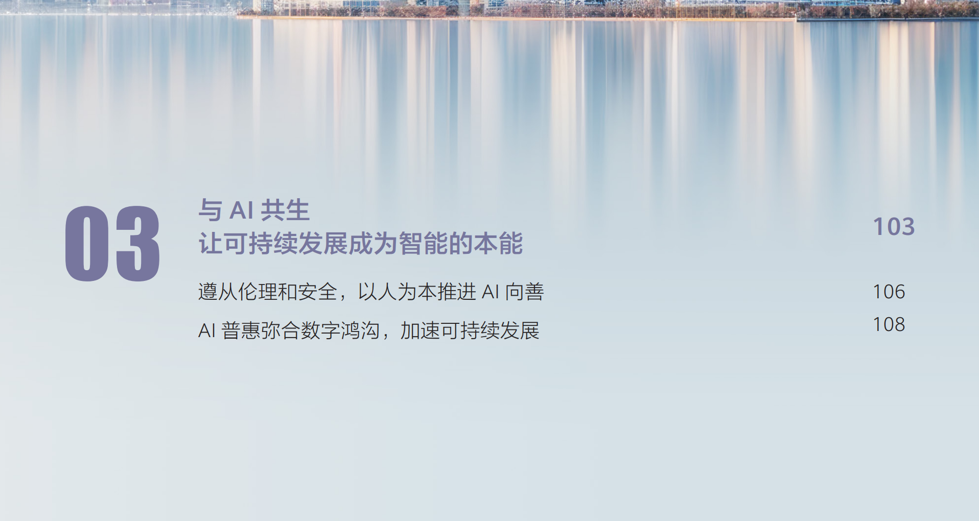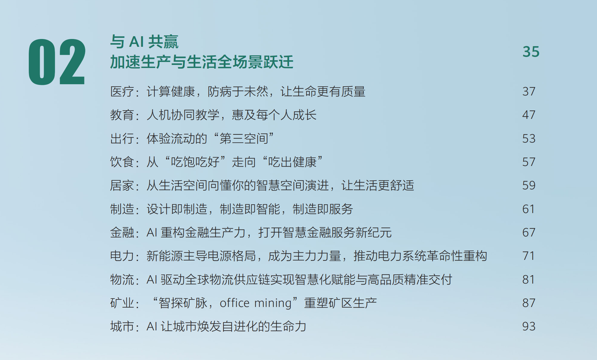 - 【智能技术普惠各行各业】 智能技术将无缝融入医疗、金融、出行、家居、能源等各个领域,核心目标是提升效率与幸福感,并确保发展成果惠及所有人,达成AI向善与普惠。