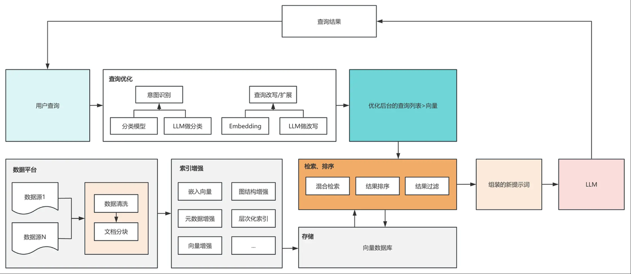 简单总结一下,就是将大模型需要的各种知识先进行向量化存储到数据库里面,然后用户询问的时候从数据库找相近的知识,检索出来之后进行重排序(rerank),获取最终的检索结果,将检索结果作为背景知识给到 LLM 生成大模型,获得基于你的背景知识的回复。