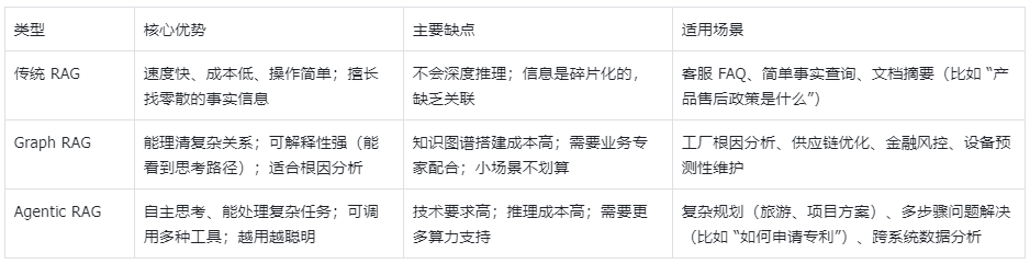选择哪种 RAG、是否混合使用,关键看你的业务需求:简单查询用传统 RAG,复杂关系分析用 Graph RAG,复杂任务规划用 Agentic RAG。