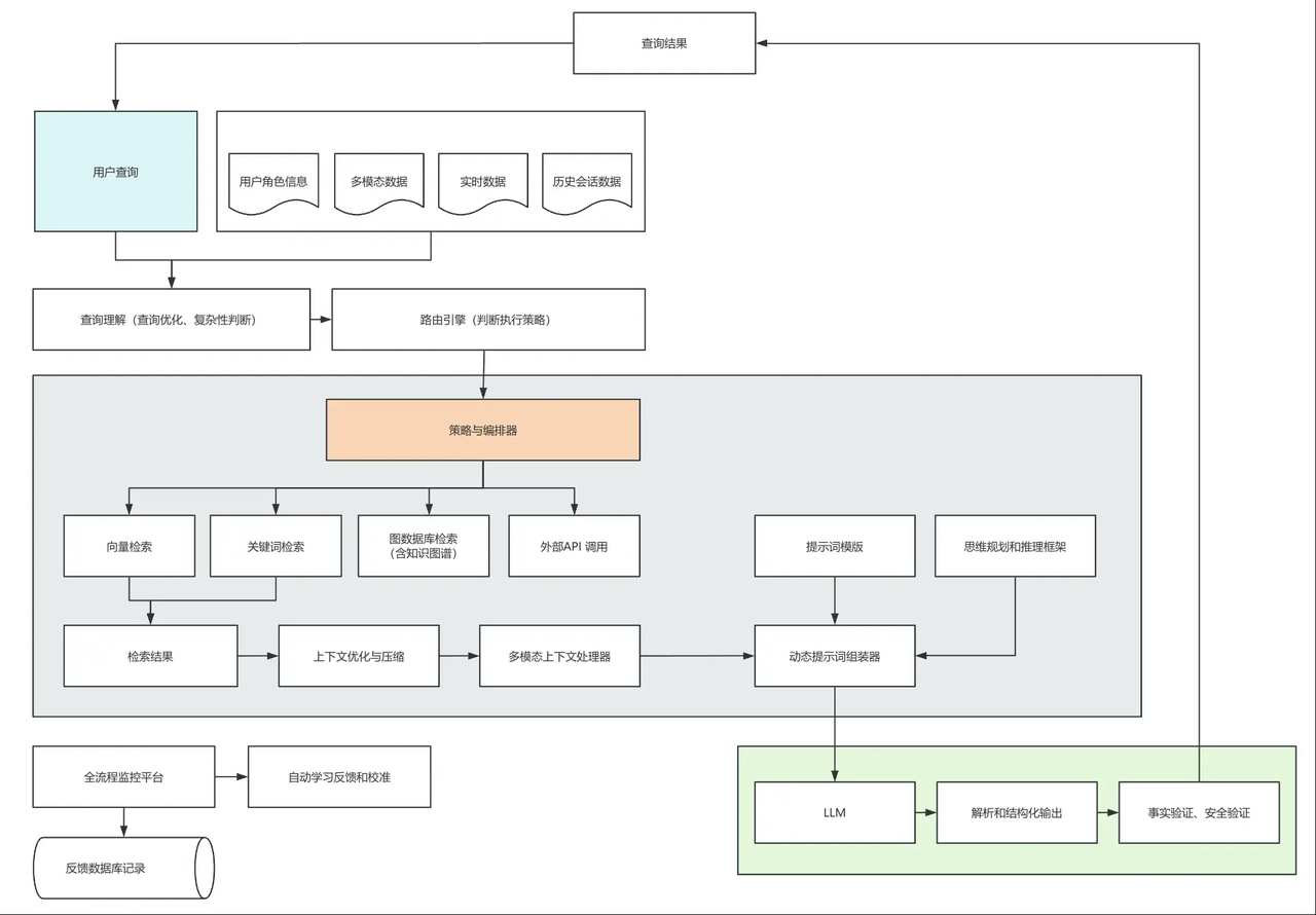 它的流程比传统 RAG 更全面:会整合用户角色、实时数据、历史对话等多维度信息,先优化查询意图、筛选关键内容,再通过 “多模态上下文处理器” 把音视频等非文本数据转成文本,最后按最优结构组装成提示词交给 AI。简单说,上下文工程是 “方法论”,RAG 是 “具体工具”——RAG 解决了 “让 AI 用指定知识回答” 的核心问题,而上下文工程则把这个问题拓展到 “如何让 AI 结合所有相关信息,更精准地回答”,比如处理多模态数据、适配不同用户角色需求等。